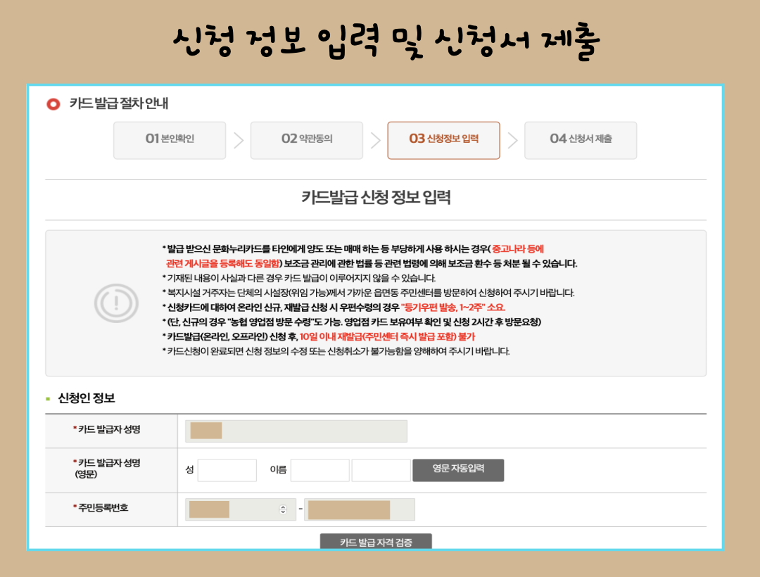 ✔︎ 온라인 신청 : 문화누리카드 신청 바로가기 클릭 → 발급 자격 검증 → 본인인증 → 상세 정보등록 → 신청 완료 후 약 15일 소요 → 완료
