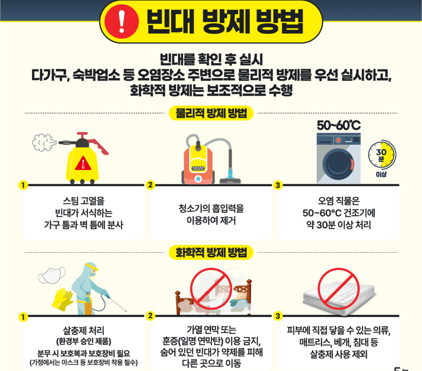 빈대 확인 후 실시 예정 다가구, 숙박업소 등 오염장소 주변으로 물리적 방제를 우선 실시하고, 화학적 방제는 보조적으로 수행