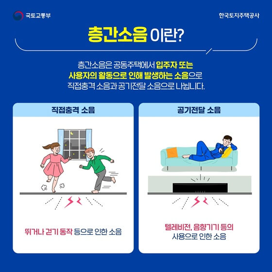 : 층간소음은 공동주택에서 입주자 또는 사용자의 활동으로 인해 발생하는 소음으로 직접충격 소음과 공기전달 소음으로 나뉩니다.